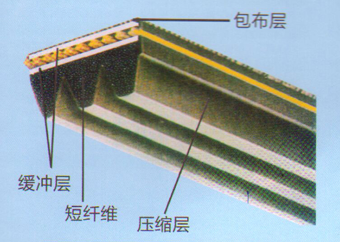 A:抗拉體(硬聚酯線繩):是膠帶的骨架層,承受著傳動過程中的全部載荷,聚酯線繩具有強(qiáng)力高,扯斷伸長率小,耐疲勞等特點,是切邊V帶較理想的抗拉材料,采用硬聚酯線繩自身的粘合性好,V帶被切割后不易松散與緩沖膠的粘合性也較好,不易脫層。